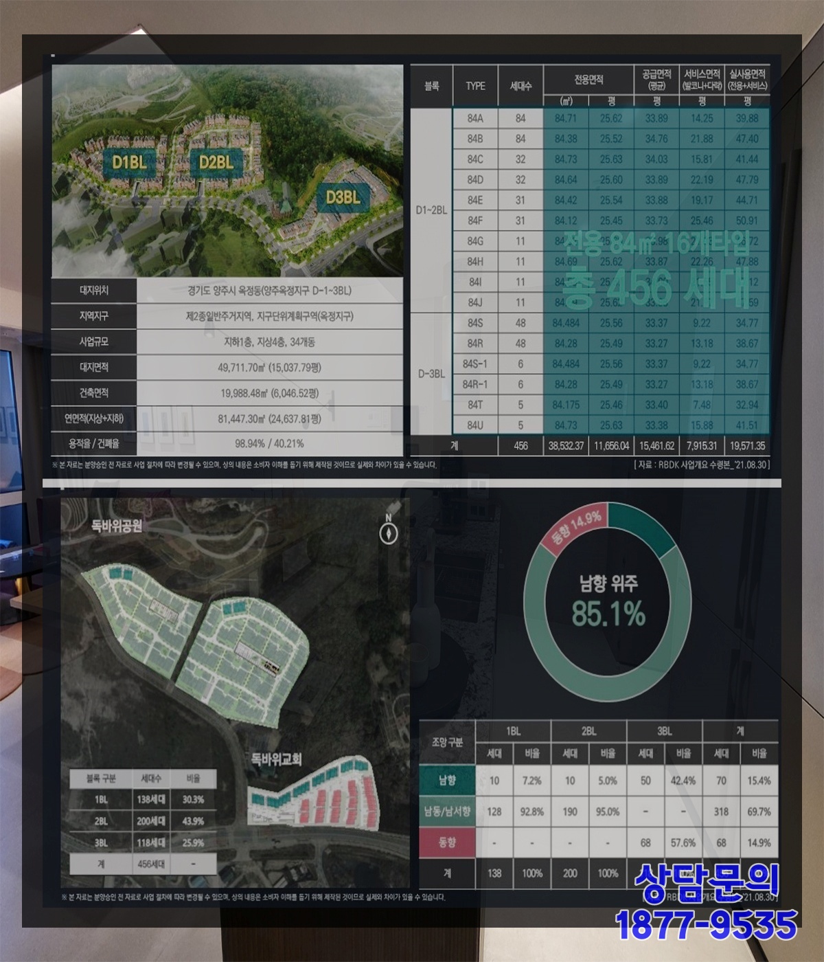 단지(團地)의 약(約) 85퍼센트는 남향(南向)을 배치(配置)되며 나머지 15퍼센트정도(程度)는 정동향(正東向)을 가집니다.