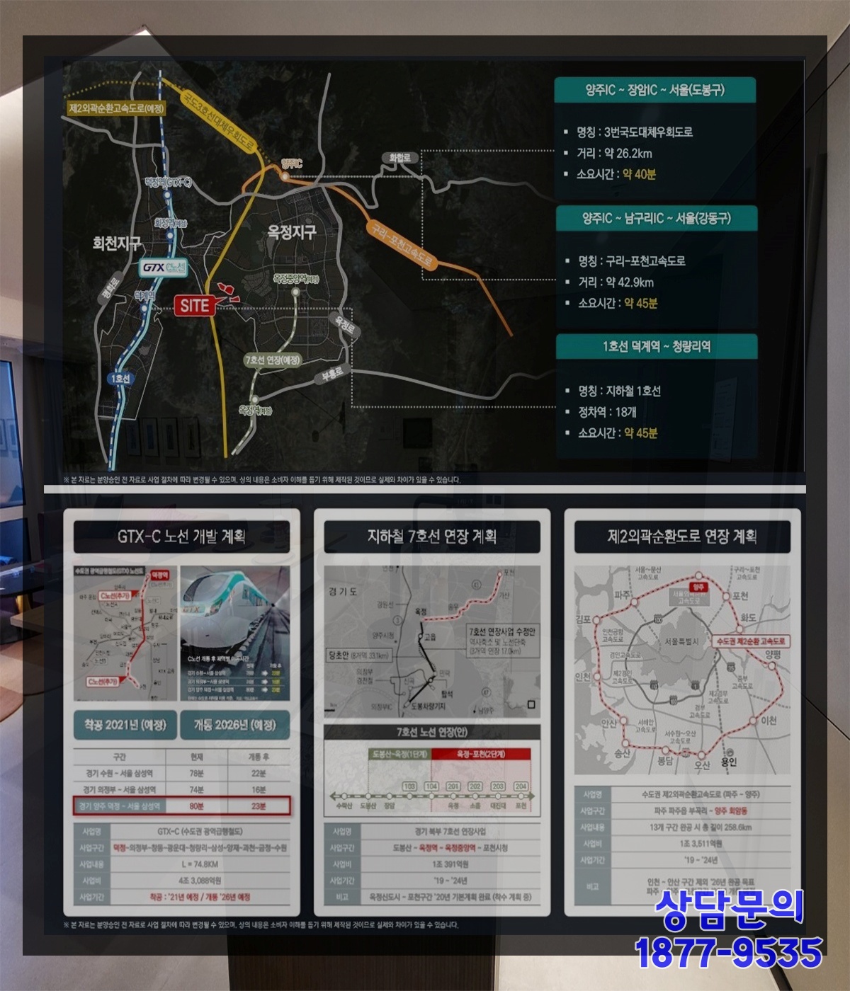 옥정역(驛)과 옥정중앙역을 개설(開設)하는 7호선(號線)의 연장(延長)안도 있으며, 수도권(首都圈) 제(第)2순환고속도로(循環高速道路) 연장계획(延長計劃)에 양주(洋酒) 회암동이 연결(連結)되는 등(等) 큼지막한 교통(交通) 개발호재(開發好材)를 가지고 있어 미래(未來)가 더욱 기대(期待)가 되는 부분(部分)입니다.