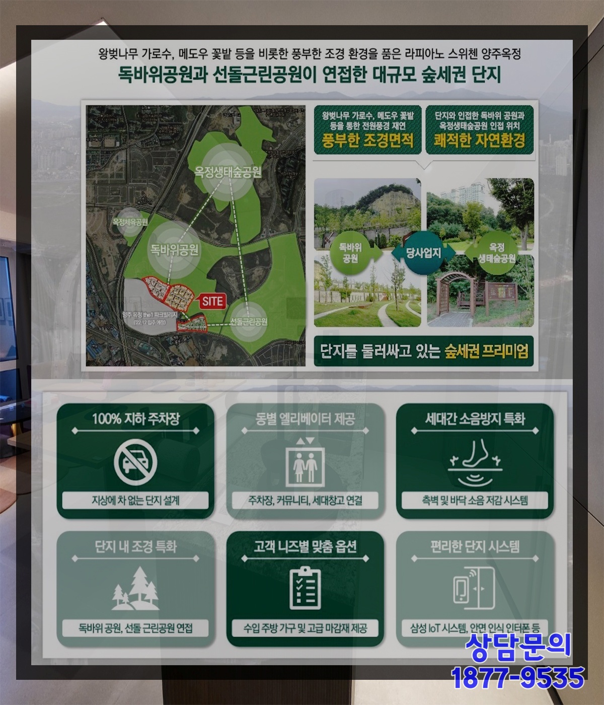 라피아노 스위첸 양주옥정 타운하우스는 단지(團地) 주변(周邊)으로 녹지공간(綠地空間)을 풍부(豐富)하게 조성(造成)할 예정(豫定)으로 단지(但只) 자체(自體)가 자연친화적(自然親和的)인 입지(立地)라고도 할 수 있으며, 체육공원(體育公園)과 호수공원(湖水公園) 등(等)의 근린공원(近隣公園)들이 다수(多數) 위치(位置)하고 있는 친환경적(親環境的)인 쾌적(快適)한 입지(立地)를 자랑하고 있습니다.