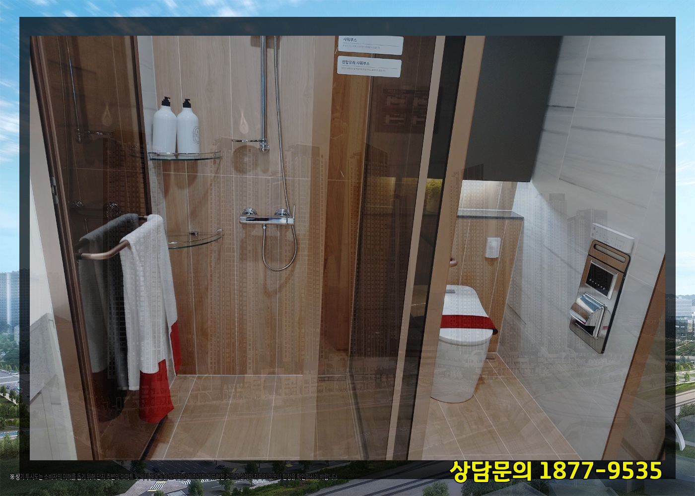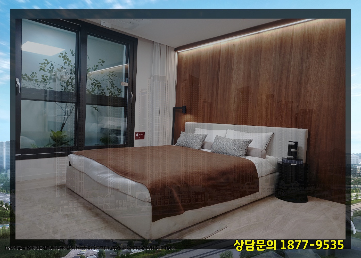 그 밖에 방(房) 하나크기로 드레스룸이 짜여지고 욕실(浴室)도 호텔식(式)으로 구성(構成)되고 거실(居室)은 이면창으로 탁 트인 조망권(眺望權)도 갖겠습니다.