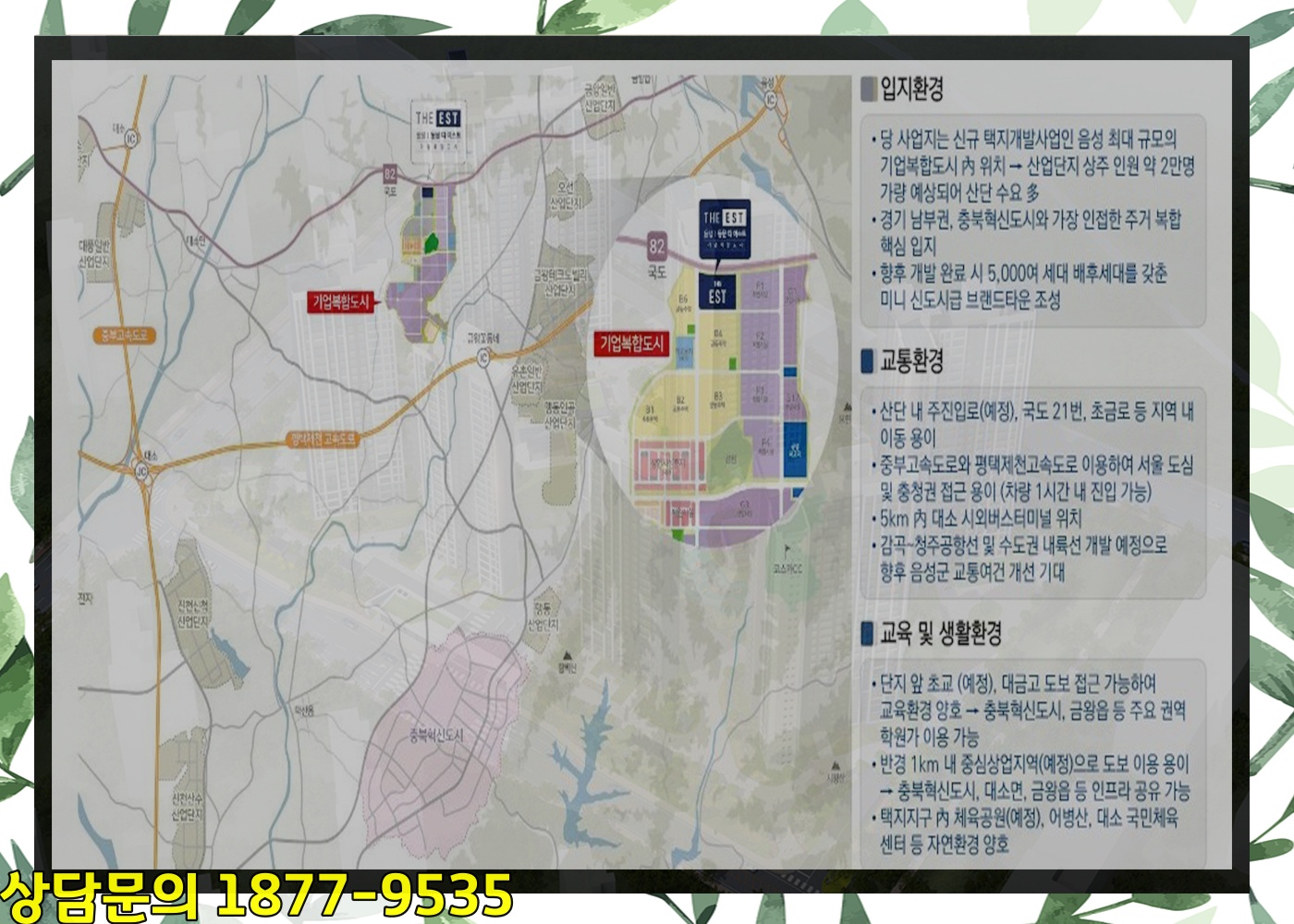 여기에 성장(成長)하고 있는 충북혁신도시(忠北革新都市)와도 가깝고 경기(京畿) 남부권(南部圈)과도 인접(隣接)한 위치(位置)라 주변(周邊) 지역(地域)과의 경제(經濟) 시너지 효과(效果)가 기대(期待)되고 있습니다.