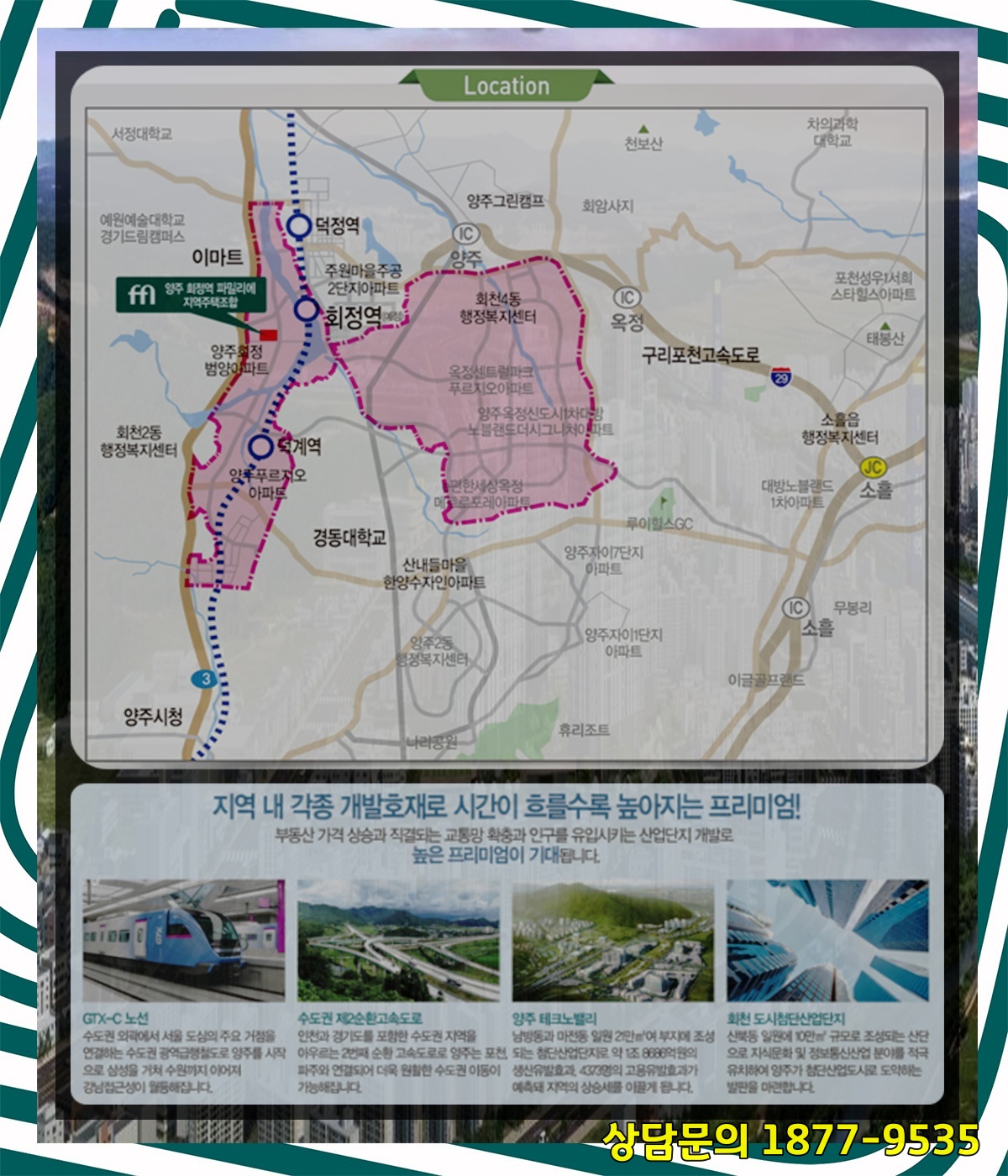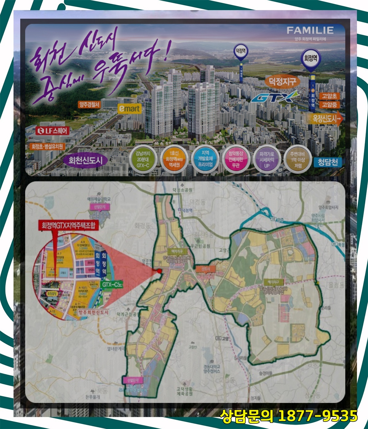회정역 파밀리에가(價) 들어서는 곳은 회천지구(回天地區)에 자리하고 있지만 바로 옆의 옥정지구의 생활권(生活圈)을 공유(共有)할 수 있는 위치(位置)입니다.