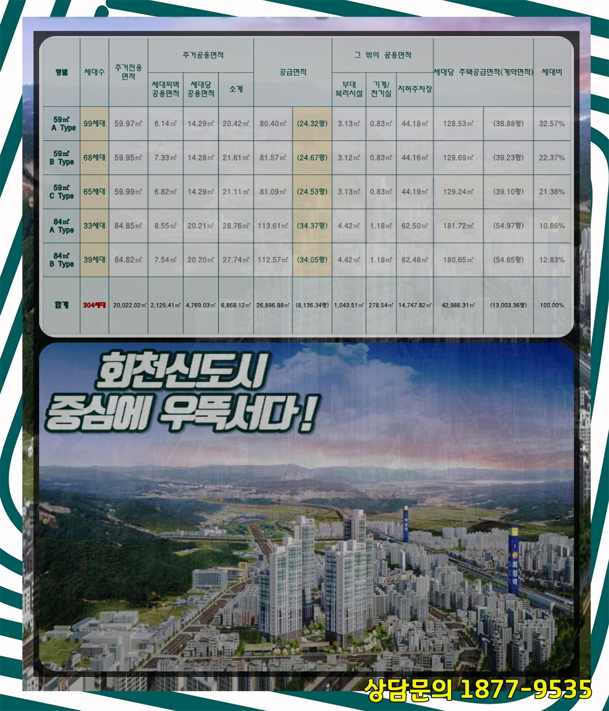 304세대(世代)를 이루는 평형대(坪型臺)는 전용(專用)59, 전용(專用)84으로 소형(小型)과 중형평형(中型坪型)으로 이루어집니다.